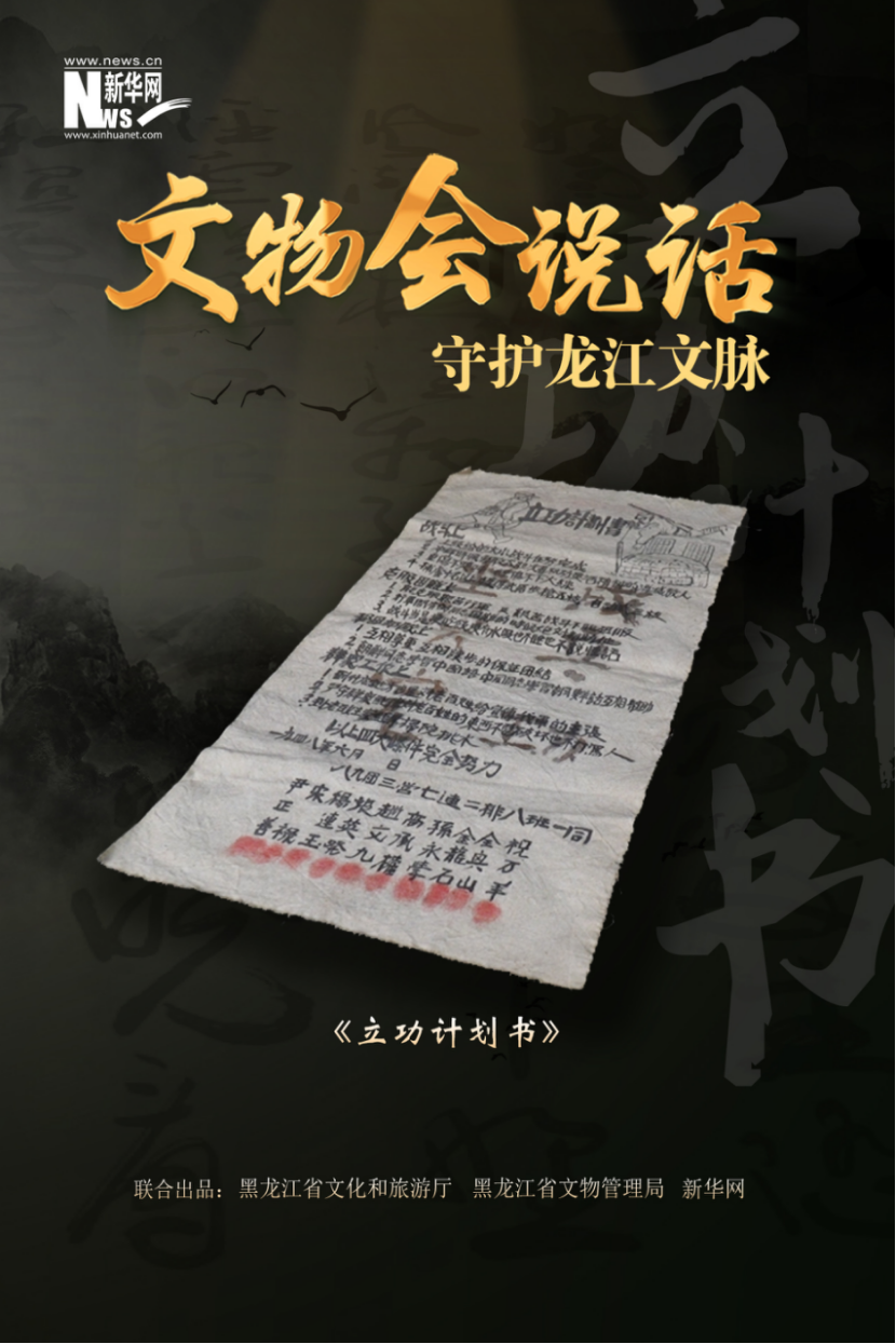东北野战军第十纵队十师八十九团三营七连八班战士的《立功计划书》:1948年6月,东北野战军第十纵队十师八十九团三营七连二排八班的10名战士在新式整军运动中写下《立功计划书》,为国家一级文物,长56厘米、宽30厘米、棉麻纤维质地(白布)。计划书上部画有正在进行战斗的战士形象;中部从“战斗上”“克服困难上”“巩固部队上”“群众工作上”四个方面制定了立功计划,还有褐色“坚决完成立功”6个大字;底部有10名战士的签名和红色的血手印,他们是尹正善、宋禄、杨连玉、张英发、赵文九、高承权、孙永学、金龙石、全兴山、祝万年。战士们用忠诚、纯朴的方式,表达了要为人民解放战争的胜利不惜奉献一切的决心。