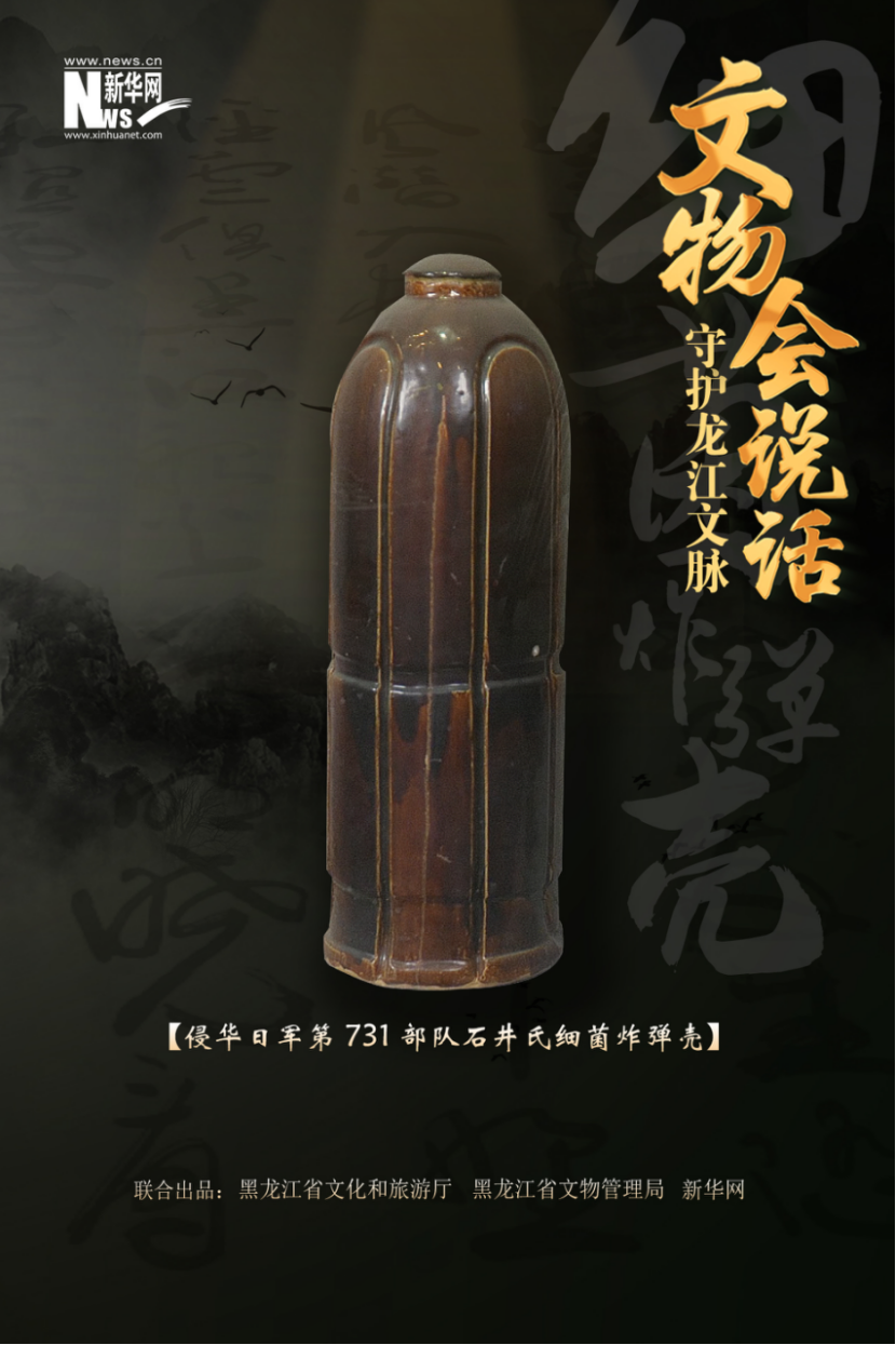 侵华日军第731部队石井氏细菌炸弹壳:日军侵华罪证,为日本法西斯分子石井四郎设计的炸弹,此炸弹仅是侵华日军第731部队研制的细菌武器之一。炸弹壳为陶质,高68厘米,腹围72厘米,重8750克。弹壳有沟槽,沟槽之内可放少量炸药,足以爆破陶质外壳。炸药的爆破力及其散放出来的热量,不至于影响弹壳内装染有鼠疫菌的跳蚤之生机。炸弹顶端装有调节降落高度的装置,从飞机上投下,炸弹降至距地面100-200米处爆炸,弹内带有鼠疫菌的跳蚤则散落地面。1941年6月,侵华日军第731部队曾在安达试验场进行惨无人道地用活人细菌试验。这枚炸弹壳是日本军国主义违反国际法进行细菌战争的重要罪证之一。