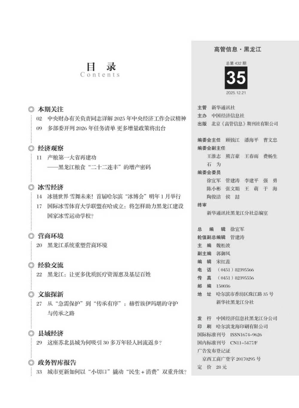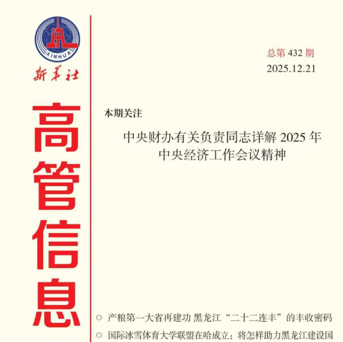 《高管信息》是新华社主管、中国经济信息社主办,具有国内统一刊号的经济信息期刊,主要刊登新华社记者采写的参考报道、决策信息,传达中央最新精神、解读最新方针政策,介绍各地各领域新成就、新经验以及遇到的新问题、新情况。《高管信息·黑龙江》紧紧围绕龙江各地党委政府中心工作,聚焦经济社会发展经验做法、问题困难、对策建议,为各级党政机关、企事业单位领导提供决策参考。