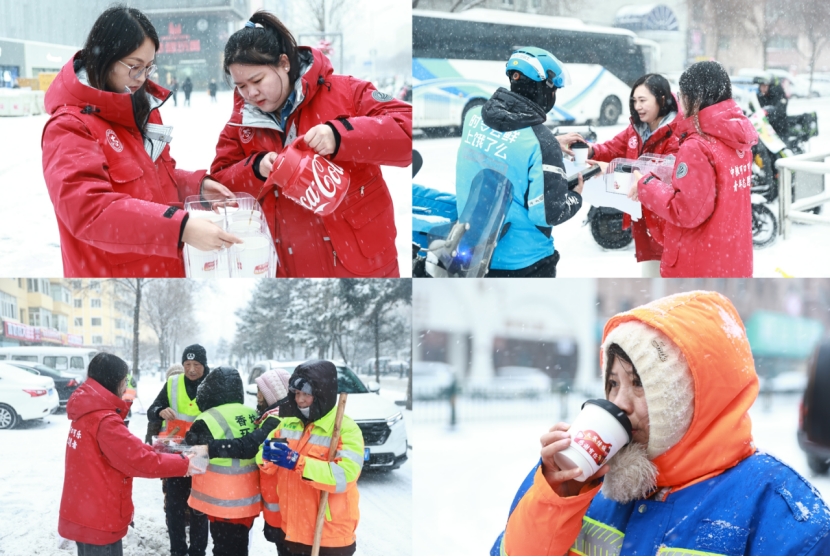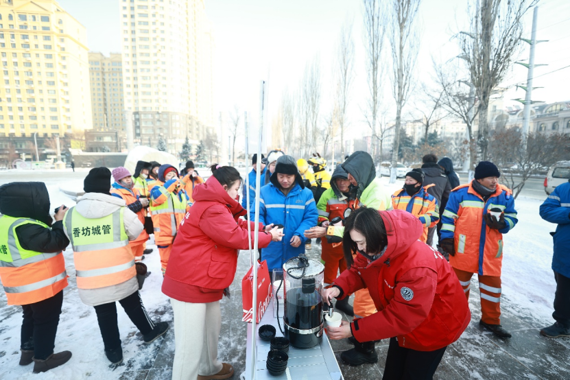 23日,哈尔滨飘起雪花,街头寒意更浓。中粮可口可乐黑龙江的志愿者团队顶着风雪,在多个主要户外作业点设置临时“暖饮站”,为正在冒雪清扫的环卫工人、穿梭在街巷的外卖员送上姜丝可乐。杯身“风雪无阻,致敬城市守护者”“天寒情暖,感谢有你”“暖冬行动,温暖传递”等字样,在皑皑白雪中格外醒目。