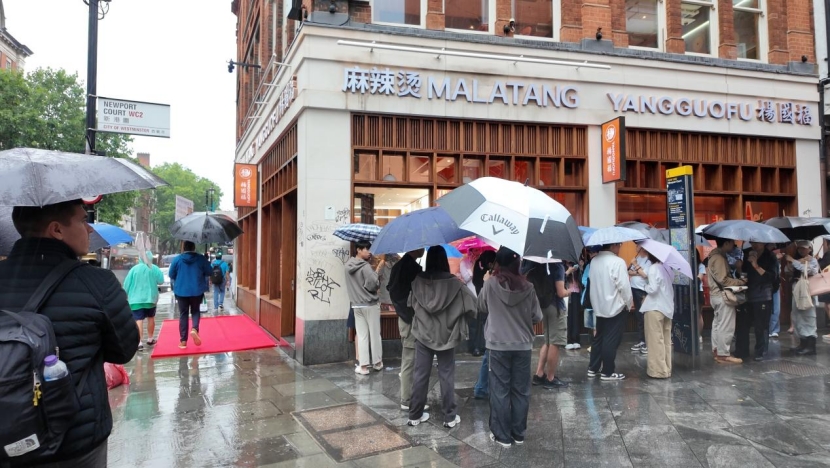 食客在杨国福麻辣烫伦敦旗舰店排队等待用餐。