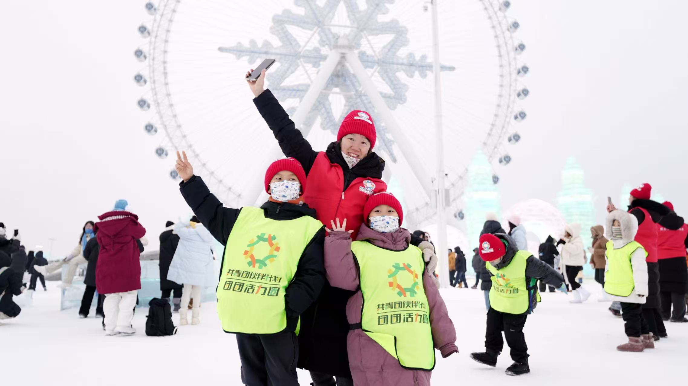 志愿者陪伴孩子们畅游冰雪世界