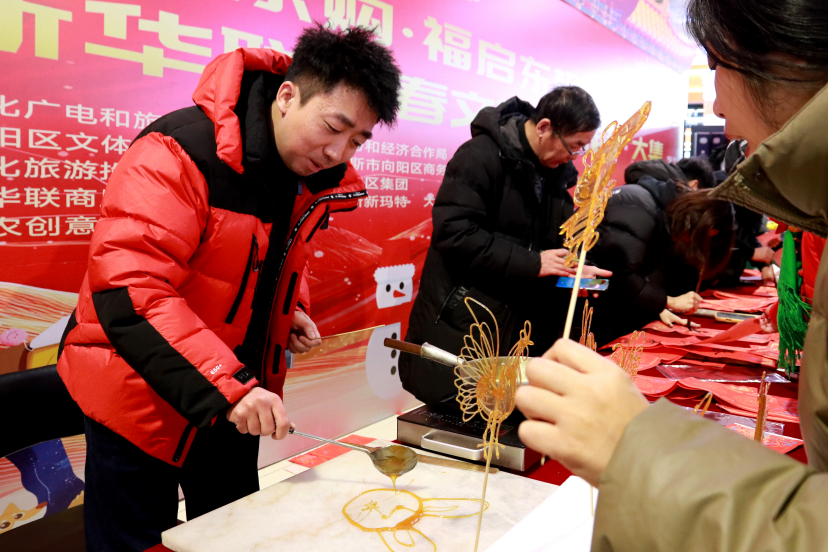 民俗互动区亮点纷呈,书法家现场书写春联福字,非遗糖画引得市民排队体验。便民服务台提供寄存、充电等服务,新春甄选区、年货礼盒区、卤味熟食区精准对接消费需求,试吃、组合券等福利提升市民体验感,收获广泛好评。