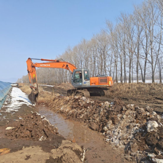 作业现场,挖掘机连续作业,破碎坚冰、清除积雪、清运杂物,逐一疏通堵塞沟渠。工作人员全程现场督导,严把作业质量,确保排水通道畅通无阻,从源头防范苗床积水、大棚倒灌等问题,为育秧、做床、摆盘、播种等关键农事环节扫清障碍。