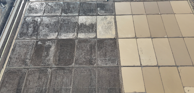 4月13日,试验在第三管理区示范户365.2亩水稻田全面展开。试验严格遵循同地块、同品种、同密度、同施肥量、同管理的“五同原则”,仅以整地技术为唯一变量,设置常规整地区与旱平免搅浆区同步推进。常规区沿用“翻地、泡田、搅浆、插秧”传统流程;旱平区采用“秋翻+卫星平地+春季浅旋+补水+插秧”技术,取消搅浆环节,在节水、省工、保护耕层等方面具备明显优势。