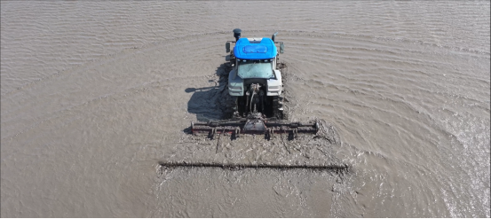 为确保整地质量,洪河农场严格规范作业流程,推行“初平+精细化打浆”一体化整地模式,确保水田达到高产种植标准。作业中,农场严格遵循分步实施原则,第一步采用卫星平地机或平地刮板完成水田初平,精准把控田块平整度、缩小高差,为后续作业奠定基础;第二步调度大马力拖拉机配套打浆设备跟进,将泥土充分搅碎耙匀,确保泥浆细腻通透。标准化作业让原本高低不平的水田变得平整如镜,彻底打通插秧前的整地关口,从源头保障插秧质量和秧苗成活率。