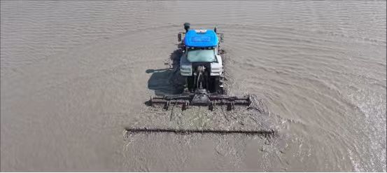为确保整地质量,农场推行“初平+精细化打浆”模式,严格分步作业:先用卫星平地机或平地刮板完成水田初平,精准把控田块平整度;再调度大马力拖拉机配套打浆设备,将泥土充分搅碎、耙匀,确保泥浆细腻均匀,从源头保障插秧质量和秧苗成活率。