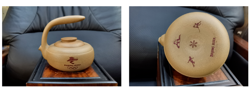 此款冰韵壶选用宜兴原矿段泥,加入五大连池火山岩泥(起名为火山陶)精工制作而成,即具备紫砂的优点又增加了五大连池岩泥的微量元素,主壶以运动器材冰壶为原型设计制作,壶嘴和壶把是一个大胆的设计,它打破紫砂壶造型的设计理念,在尽量不破坏冰壶造型的基础上又具备茶壶的功能是紫砂壶造型的创新之作。此款壶2017申请外观设计专利。专利号:CN2017305669539(所有图文素材均为参展商提供)